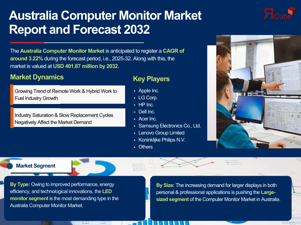 The Australia Computer Monitor Market is anticipated to register a CAGR of around 3.22% during the forecast period, i.e., 2025-32. Along with this, the market is valued at USD 401.87 million by 2032. The industry for computer monitors in Australia is growing progressively owing to increasing demand from numerous industries, such as gaming, corporate settings, education, and home-based installations.